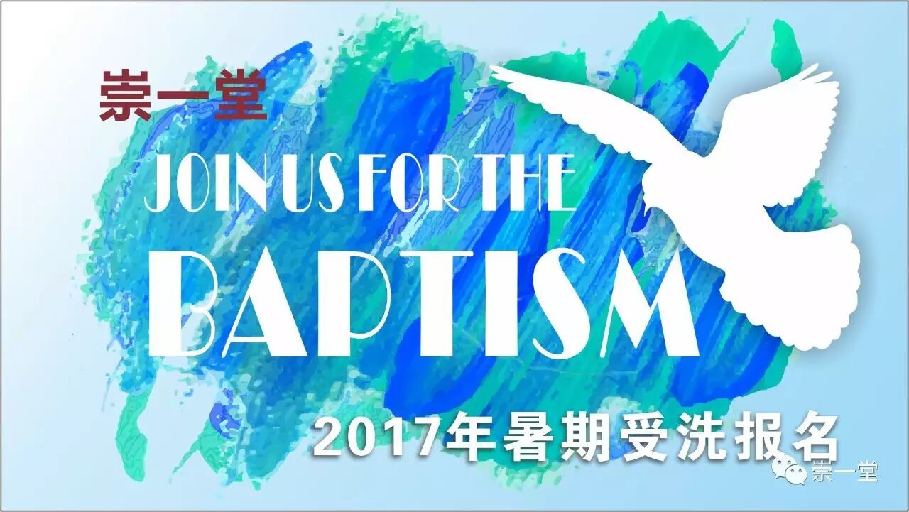 崇一堂2017年暑期受洗报名通知 2017年暑期受洗报名开始啦! 报名时间: 6月4日至7月9日 ① 每天的8:30-16:30; ② 每周二、三、五和周日的晚上 报名地点: 崇一堂综合楼二楼201教牧办公室 受洗要求: 1.听道一年左右 2.清楚蒙恩得救 3.自愿公开信仰 4.渴慕加入教会 温馨提醒: 具体报名时间以教会通知为准,报名期间因周日报名比较集中,请尽量选择周间报名。若有不明事项,请联系0571-86961163教牧办公室咨询。耶稣爱你! 崇一堂目前每年有两次洗礼,一次是复活节(报名时间约在2月份),一次是暑假期间(报名时间为6月份)