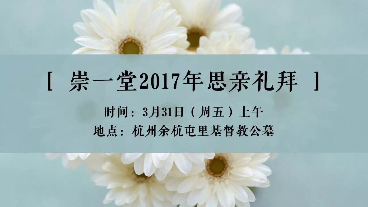 崇一堂2025年思亲礼拜 崇一堂2025年思亲礼拜 时间:2025年4月1日(周二)上午 9:15; 地点:杭州临平区印花坞基督教公墓; 注:3月23、30日两周主日在大堂大厅有售车票。鼓励年轻的弟兄姐妹自行前往,照顾年长的肢体。 点击这里一键导航到目的地
